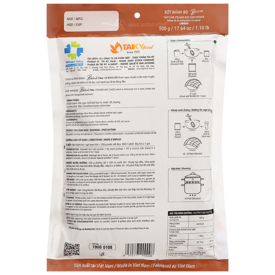 Bột bánh bò được phối trộn theo công thức tối ưu, giúp tạo nên thành phẩm bánh mềm, xốp và có độ dai đặc trưng. Nguyên liệu chọn lọc, đảm bảo an toàn và giữ được hương vị truyền thống.